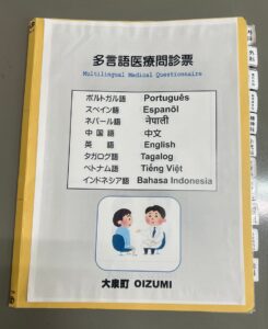 大泉町では、日本語を充分に話せない外国人住民の方々が、病気やけがをしたときに、その症状を母国語で医師などに伝えられるように、NPO法人国際交流ハーティ港南台、公益財団法人かながわ国際交流財団のお力添えのもと、ポルトガル語を含む8カ国語の「多言語医療問診票」冊子を作成しました。